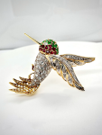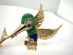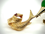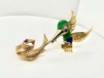 18kt YG Diamond/Emerald/Ruby Bird holding Fish Brooch (kingfisher)